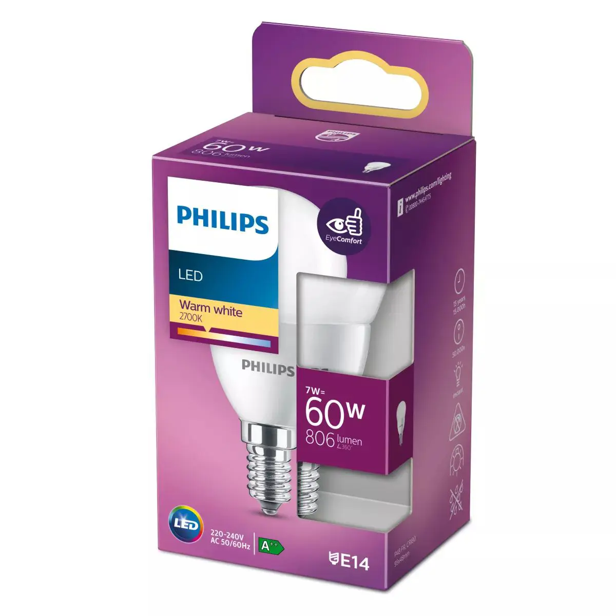 PHILIPS LED chandelier P48 7W/60W E14 2700K 806lm NonDim 15Y opal